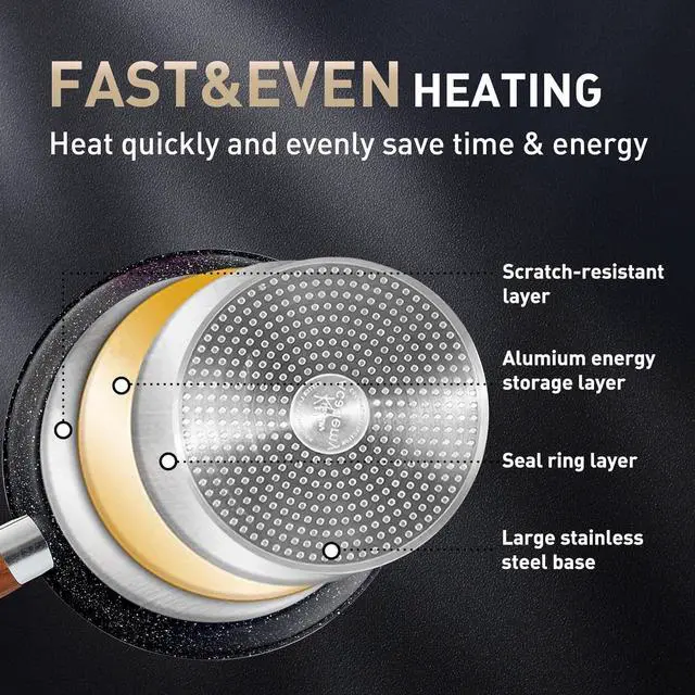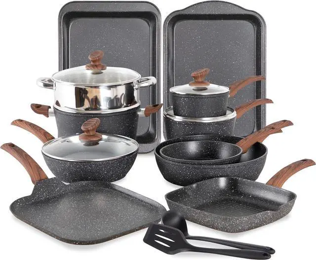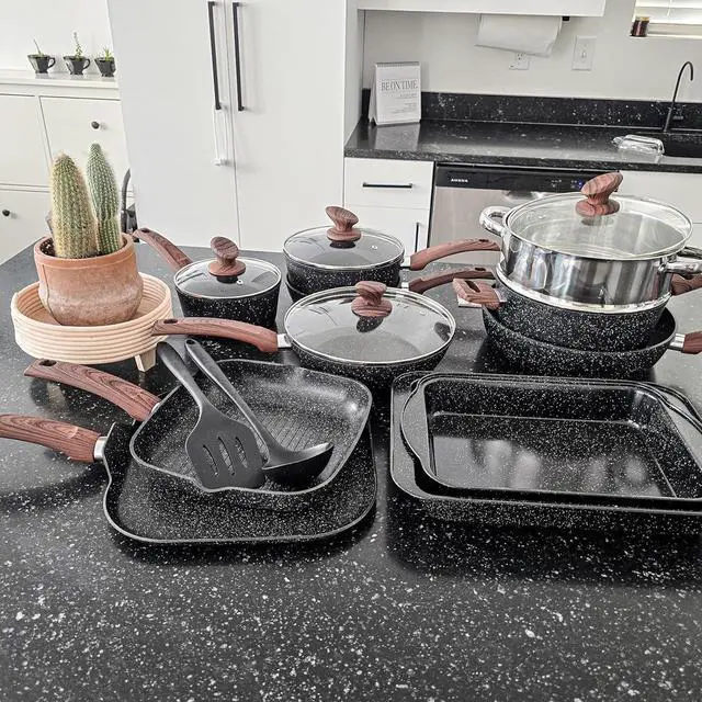 Nonstick Granite Stone Coating: The pots and pans set features a durable granite stone coating that ensures easy food release and quick cleanup. The coating is also scratch-resistant and safe for use with metal utensils