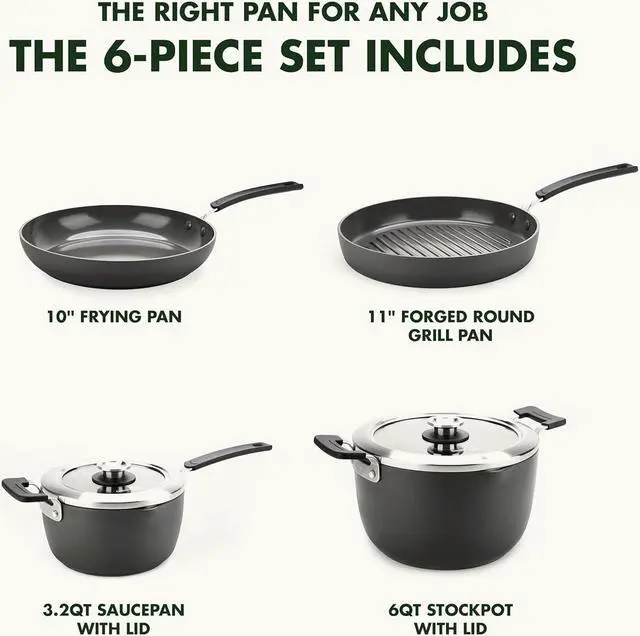 Cookware Set Includes: 10 frypan, 11 round grill pan, 3. 2QT saucepan with lid, and 6QT stockpot with lid