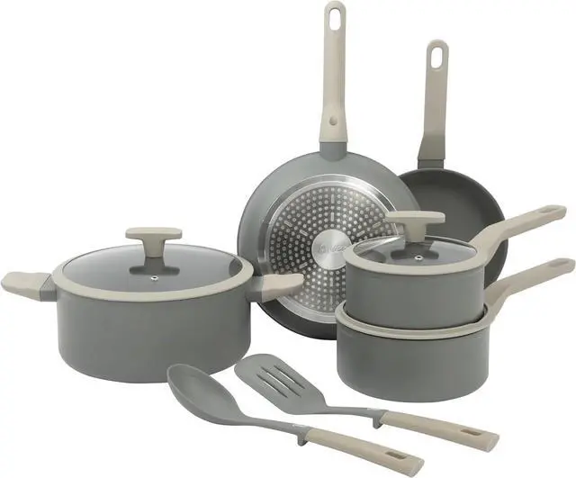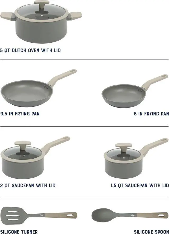 A COMPLETE SET INCLUDES: Two frying pans (8 inches and 9.5 inches), two saucepans with lids ( 1.5 quarts and 2 quarts), one 5-quart Dutch oven with lid, one silicone turner and one silicone spoon