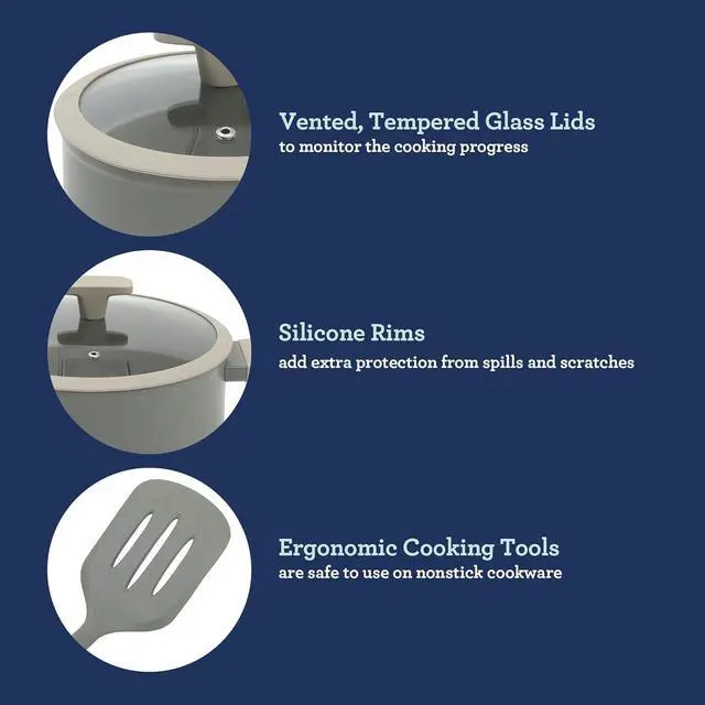 NONSTICK INTERIOR: Perfect for making your no-fail favorites and crowd-pleasing specialties, this cookware set has a nonstick interior to promote easy food release and cleanup. Make delicious and healthier meals in these pots and pans that take the stress off of cleaning up after every use.