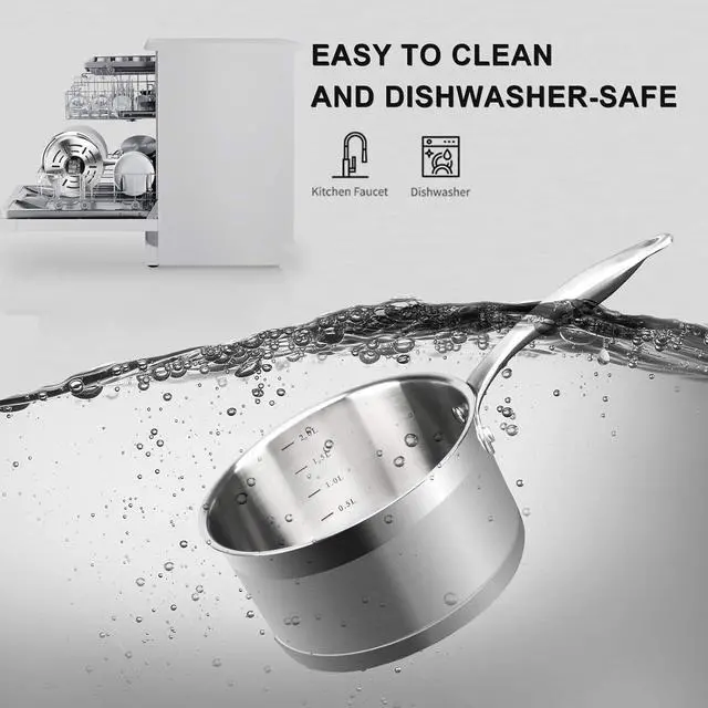 HIGH QUALITY MATERIAL: This 2.5 quart saucepan is manufactured with food grade 304 stainless steel featuring an impact-bonded base allowing for fast and even heating.