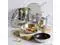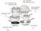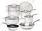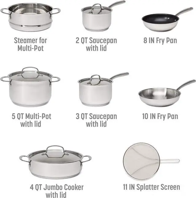 SET INCLUDES: 2 quart sauce pan with stainless steel lid, 3 quart sauce pan with stainless steel lid, 8" non-stick fry pan, 10" fry pan, 5 quart Dutch oven with stainless steel lid and steamer basket insert, 4 quart jumbo cooker with stainless steel lid, 11.25 " splatter screen