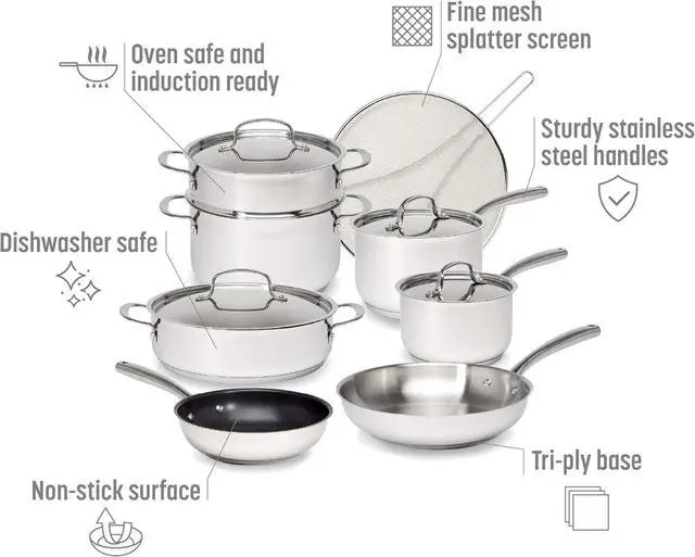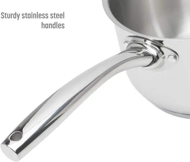DURABLE STAINLESS STEEL: This pots and pans set is constructed with stainless steel, which is known for being durable, long-lasting, versatile and easy to clean.