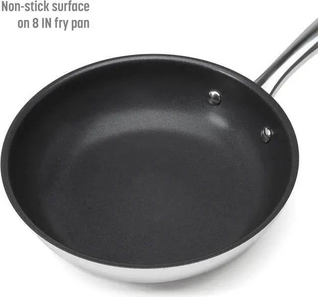 BEST OF BOTH WORLDS: This set comes equipped with a non-stick fry pan, perfect for making delicate eggs and sticky foods, while the rest of the set is made of durable stainless steel.