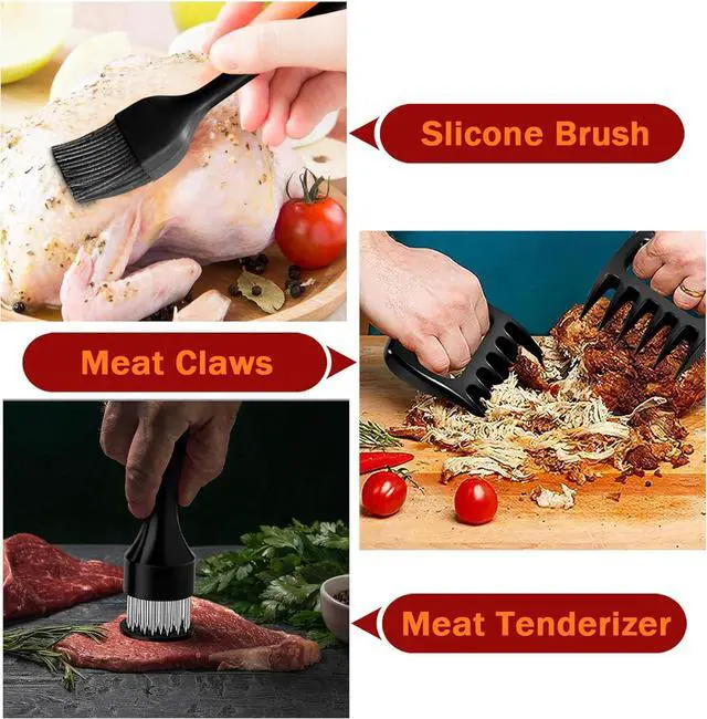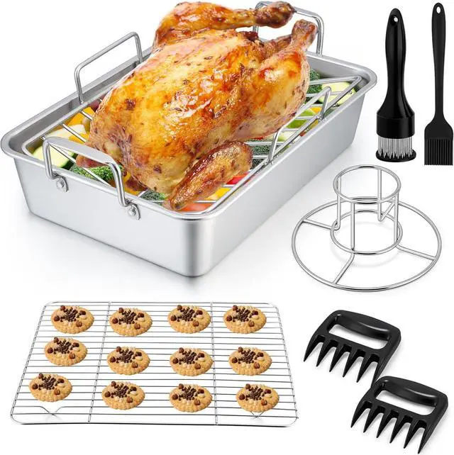 A VERSATILE SET - 8 PCSBaking pan is perfect to bake lasagna / deep pizza/ brownie, V rack is easy to roast turkey /ribs /brisket, The flat baking rack can be used as baking and cooling rack, Round chicken holder can grill chicken evenly, Adding 4 accessories to help baking easily, Silicone brush for brushing sauce on meats, Meat tenderizer will make meats more tender and marinades deeper, 2 Pcs meat claws could easily grasp and shred pork, chicken, and more with the claws