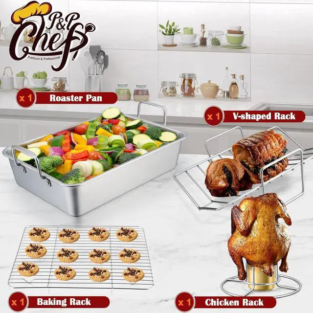 HEALTHY & HEAVY DUTYP&P CHEF roasting pan and racks are made of premium stainless steel, No worries any toxic material leeching into your food, Healthy for your daily use, Solid steel construction with firm welding, Holds up to 16 lbs food, Warp resistant and durable use, Great replacement to aluminum or nonstick sets
