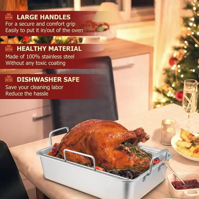 OVEN &DISHWASHER SAFEOur roasting racks are polished by mirror finished and roaster pan is produced to brushed surface, Make it released food easily, Pure stainless steel material is rust-free and keep them shiny after washing, Dishwasher safe to save your effort and time, Easy to clean by soapy water and sponge, Both roaster pan and racks are oven safe for baking and roasting