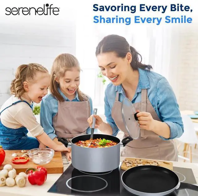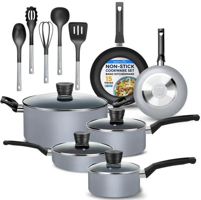 The SereneLife 15-Piece Non-Stick Kitchenware Pots & Pans Set (SLCW15GRY) is a durable, stylish, and functional cookware set designed to meet the needs of home chefs. Featuring a black non-stick interior and a heat-resistant lacquer exterior, this set ensures effortless cooking and easy cleanup.