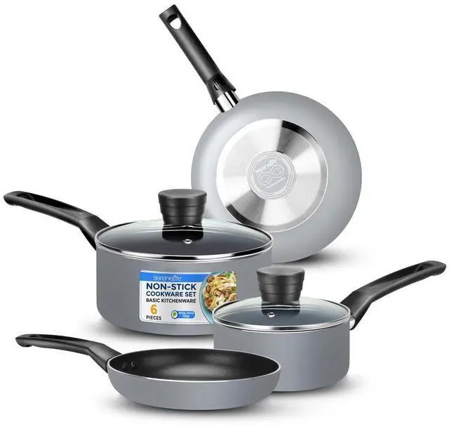 Upgrade your kitchen essentials with the SereneLife SLCW6GRY 6-Piece Non-Stick Cookware Set, a stylish and practical addition to any home. This basic cookware set features multi-sized pots and pans with a non-stick black interior and a heat-resistant lacquer exterior for both durability and aesthetic appeal.