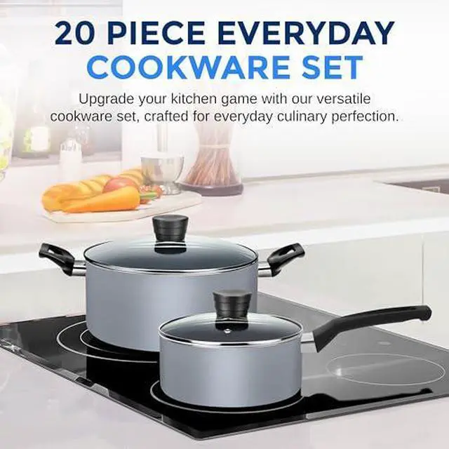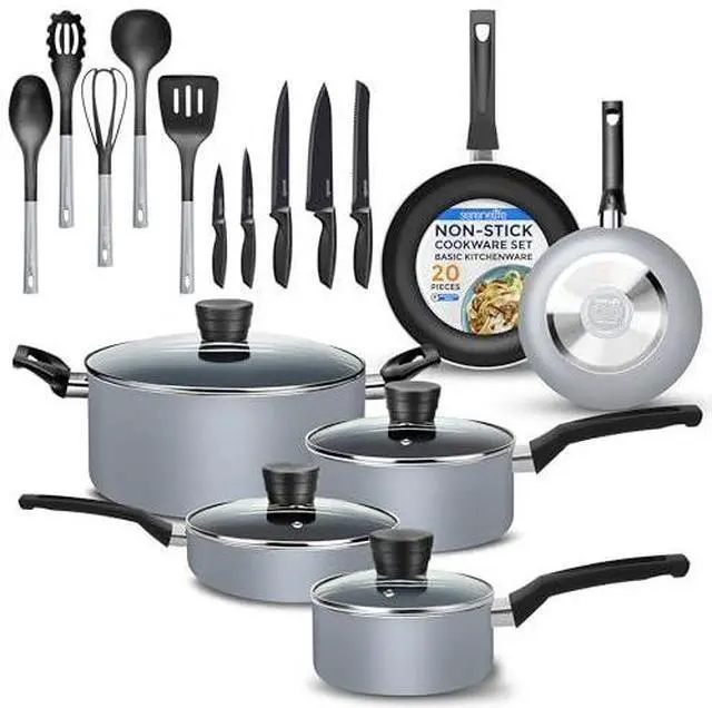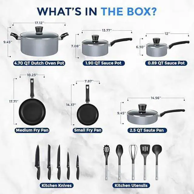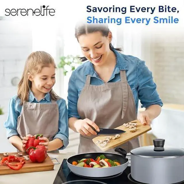 20-PIECE SET: The SereneLife Cookware Set features 20pc nonstick set which includes 0.89 & 1.90qt sauce pots w/ lids, 4.70qt dutch oven pot w/ lid, 2.5qt saute pan w/ lid, 8 & 10 fry pans, spoon, spatula, pasta server, ladle, whisk, and a knife set