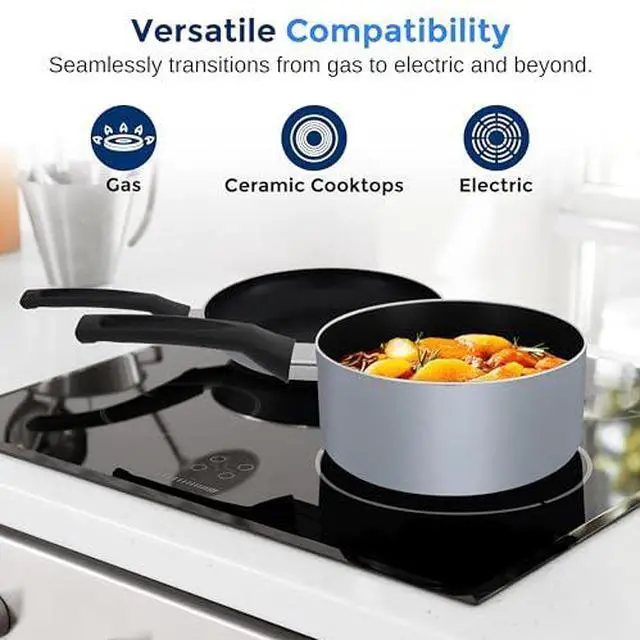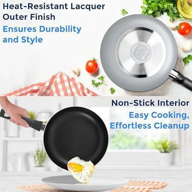 NON-STICK SURFACE: This cookware set boasts a durable, PFOA/PFOS-free non-stick coating, ensuring effortless food release, easy cleaning, and healthier cooking. Its heat-resistant lacquer exterior stands up well to high temperatures.