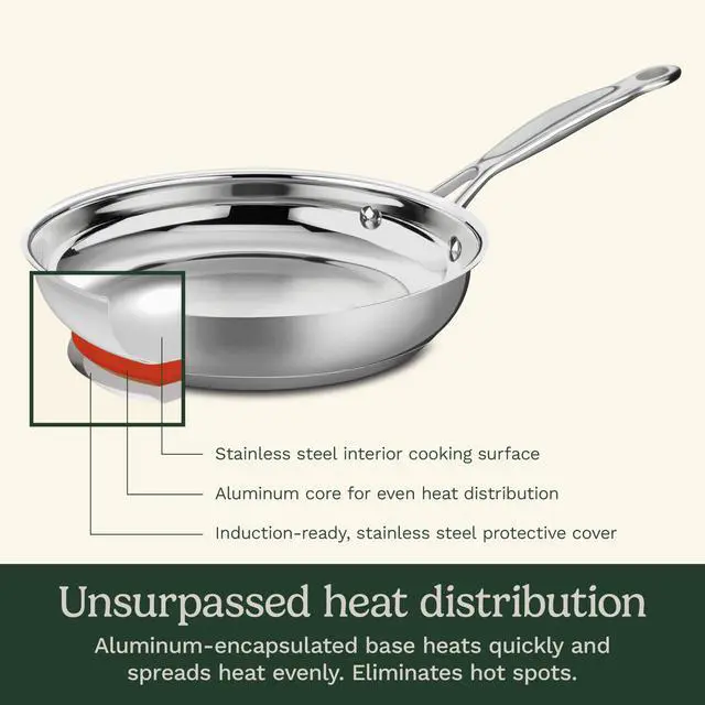 The kitchens of France were the inspiration behind the elegant Cuisinart Chef's Classic Stainless Cookware Collection. Our 10" Skillet is induction ready and features stainless steel and pure aluminum encapsulated in the base for fast and even heating.