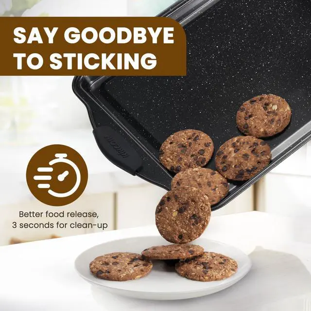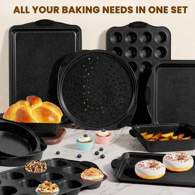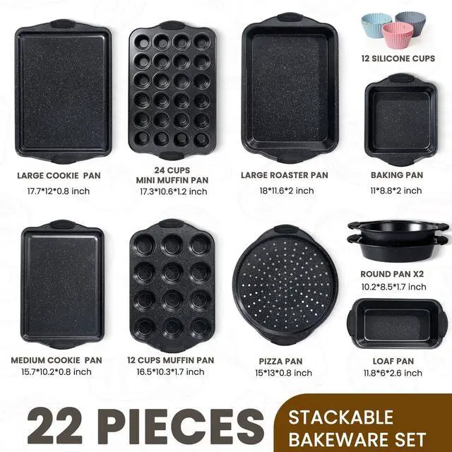 | Included Components | large roaster pan (18*11.6*2 inch), large cookie pan (17.7*12*0.8 inch), medium cookie pan (15.7*10.2*0.8 inch), pizza pan (15*13*0.8 inch), 12-cup muffin pan (16.5*10.3*1.7 inch) with 12 cupcake liners for baking, 24 cups mini muffin pan (17.3*10.6*1.2 inch), square pan (11*8.8*2 inch), loaf pan (11.8*6*2.6 inch), 2 round cake pans (10.2*8.5*1.7 inch) |