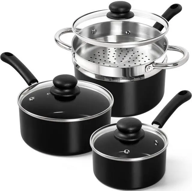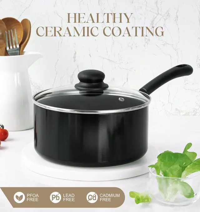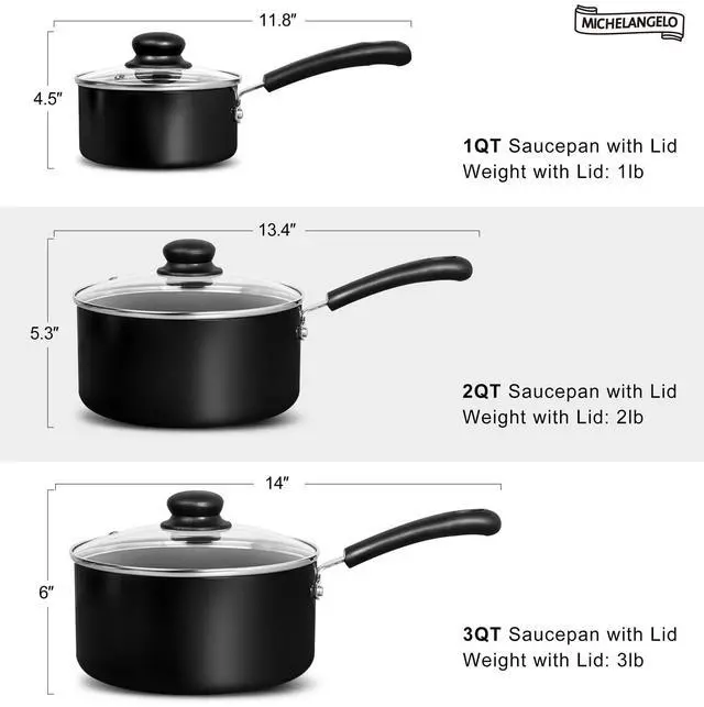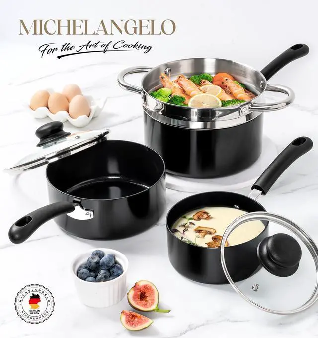 MICHELANGELO Nonstick Saucepan with Lid, Ceramic Sauce Pan Sets with Steamer, Easy to Clean Sauce Pans, Multi-Purpose Cooking Pots, 1QT & 2QT & 3QT, with Steamer, Black
