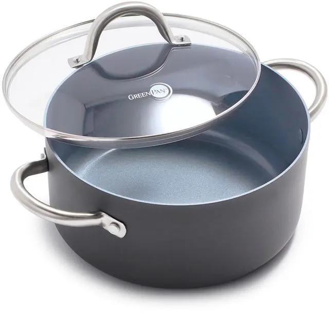 Whether youre making big meals for the family or you just need some extra space, this versatile and durable casserole makes things simple. Crafted from hard anodized aluminum, this 5-quart pot is lightweight and scratch-resistant, making it perfect for daily use. The pots comfortable stainless steel handles give you an easy grip and the tempered glass lid gives you a quick and easy view of your food without sacrificing heat. This casserole features GreenPans signature Thermolon ceramic nonstick coating, which is made without PFAS, PFOA, lead, and cadmium, so it wont blister, peel, or release harmful fumes if you accidentally overheat it. Oven and broiler safe up to 600°F, lid 425°F. Hand wash only. Limited lifetime .