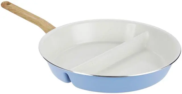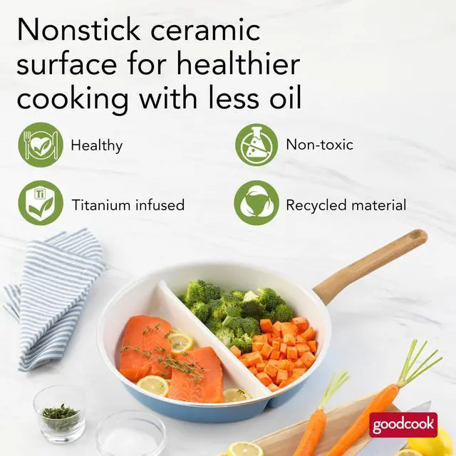 The GoodCook Healthy Ceramic Divided Fry Pan can turn up the heat on two dishes simultaneously and decrease the amount of cleanup afterward. Its aluminum vessel creates an even cook for both dishes with ease. Enjoy every thoughtful detail like its ergonomic handle for a comfortable grip and toxin-free composition for a healthy cook every time. The sleek and unique design will fit perfectly in your collection.