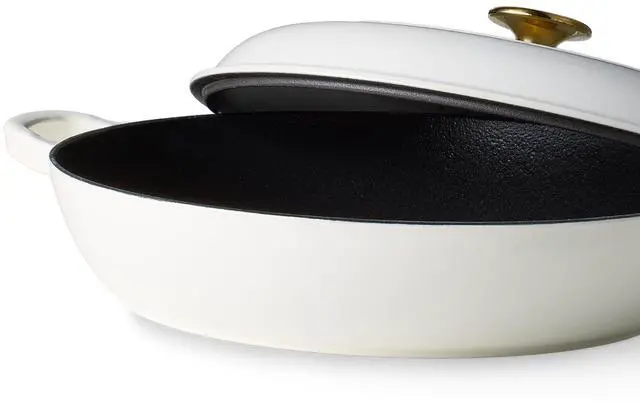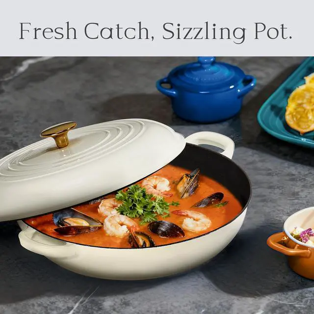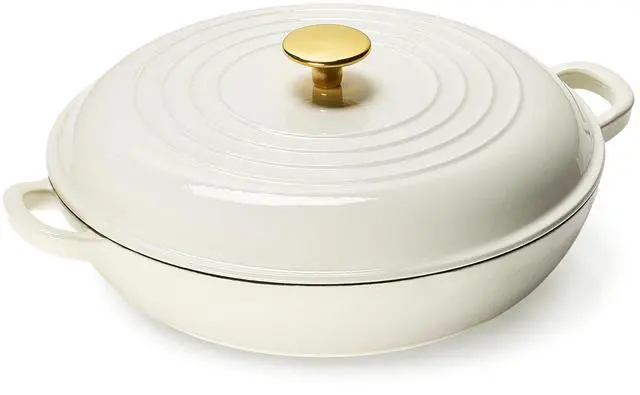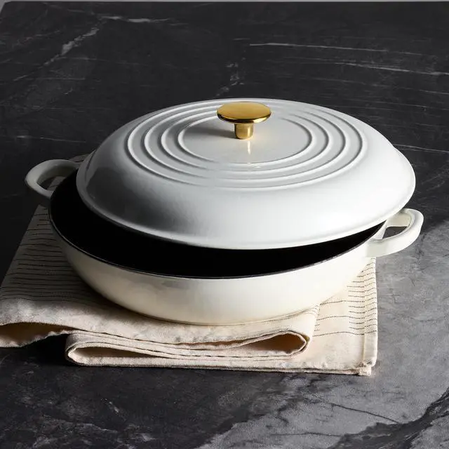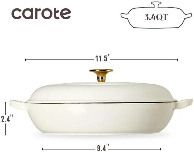 Classic Design: Carote enameled cast iron pot features a porcelain-enameled shell and a spray-painted finish for durability and stylish aesthetics that complement any kitchen. Our shallow braiser pan features sturdy double handles and a matching lid, and its ergonomic design makes it easy to move from stovetop to oven.
