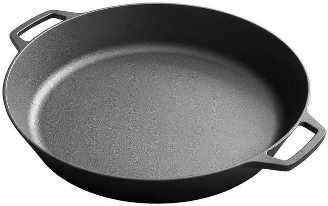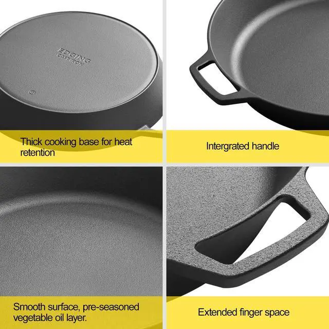 Integrated two loop handles: Pre-seasoned cast iron skillet come with two integrated smooth handles on each side.You can easily lift and move the skillet frying pan more conveniently to dinner table