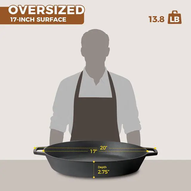 Pre-seasoned cast iron skillet: EDGING CASTING 17 inch extra large cast iron skillet is made of premium heavy duty cast iron,which is pre-seasoned with vegetable oil,(no synthetic coatings or chemicals)