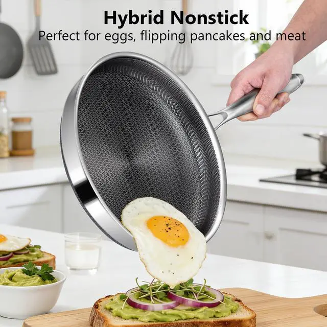 Tri-ply Food-Grade Stainless Steel PanOur non stick skillets craftes from premium food-grade stainless steel for lasting durability. Free from harmful coatings, PFOA, PTFE, PFAS, lead, cadmium, and other bad metals or substances