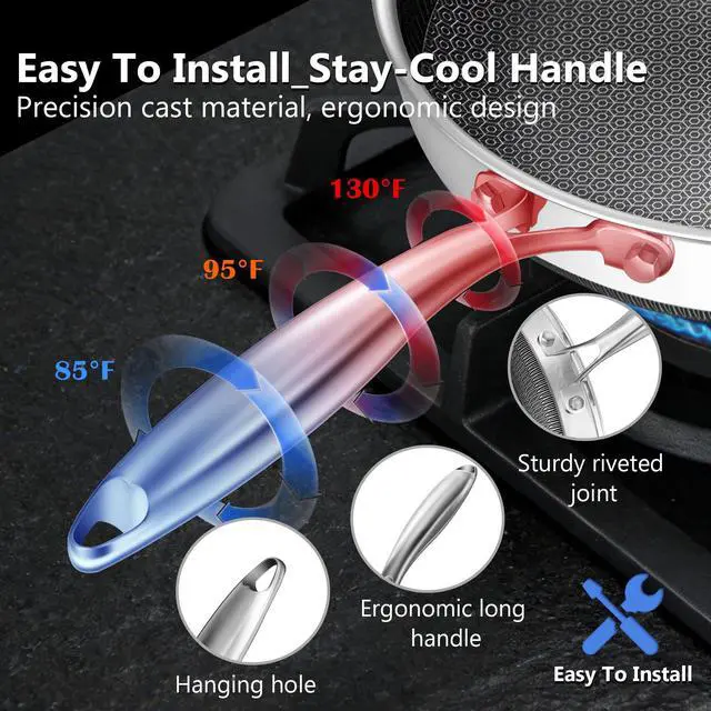 Easy-to-install Stay-Cool HandleOur non stick frying pans with stainless steel handle effectively dissipates heat, concentrating it in the chef pan body. This ensures the handle stays cool to the touch on the stove, enabling comfortable cooking. Installation accessories are included for easy disassembly and storage