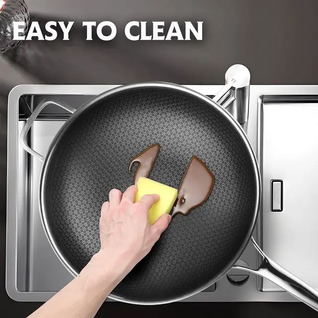 [HIGH-QUALITY MATERIALS]: Made with High-quality stainless steel, our wok pan is built to last. The healthy surface is completely non toxic for the better balance of utility and performance than Teflon, ceramic, or cast iron pans.