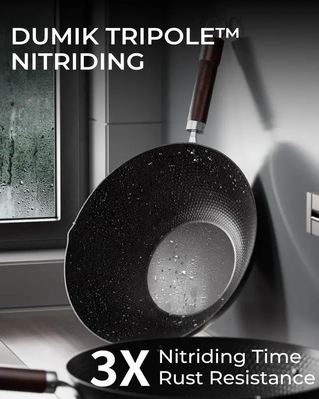 DUMIK TRIPOLE Nitriding: This wok features advanced nitriding technology from Japan (not made in Japan). With a triple-long nitriding process, it boasts superior strength, exceptional abrasion resistance, and three times rust protection. Even after the rigorous 72-hour corrosion test, it remains as clean as new.