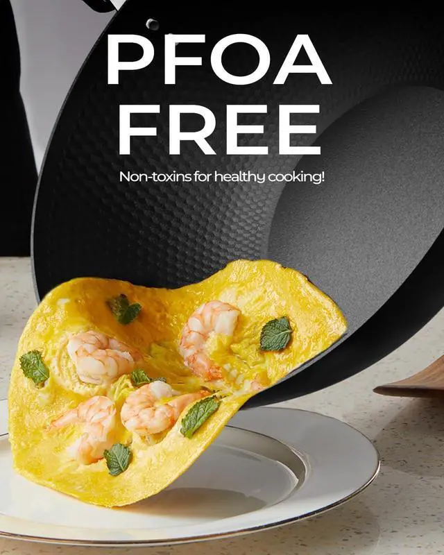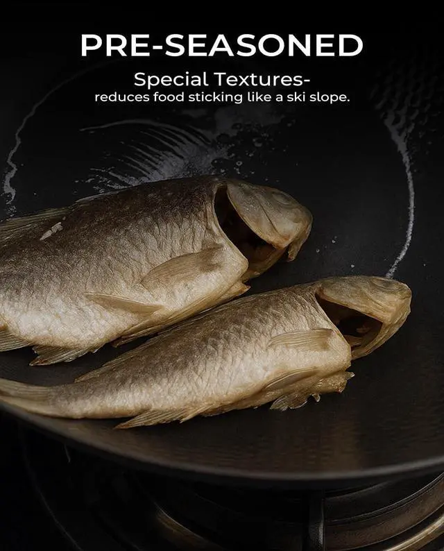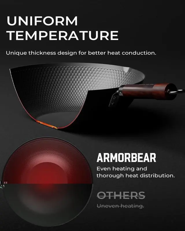 Pre-Seasoned & Naturally Nonstick: Armorbear wok is made from high-quality carbon steel, ensuring durability. Pre-seasoned and ready to use right out of the box. Featuring a well designed textured surface that resembles a ski slope, this stir-fry pan minimizes food sticking. With proper seasoning, you can easily achieve a natural non-stick finish. NO COATINGS, NO PFOA and NON-TOXIC.