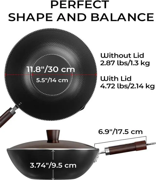 Perfect Heat Conductivity: Made from high-quality carbon steel and utilizing advanced pressing technology, our wok features a thickened bottom with relatively thinner edges. This construction not only prevents warping but also provides quick and even heat distribution for frying, grilling, sautéing, and simmering. Its the perfect choice for all your cooking needs!