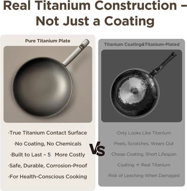 Pure Titanium DurabilityMade from 100% pure titanium, this cookware is corrosion-resistant, high-temperature durable, and free from harmful substances for a safe, healthy cooking experience. Lightweight yet strong, it prevents chemical reactions, preserves foods natural flavors, and resists metal utensil damage. The zero-coating design ensures worry-free, long-lasting performance.