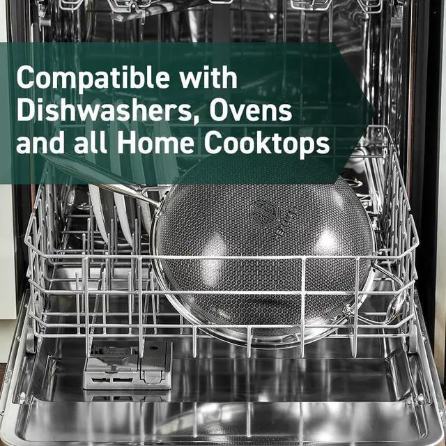 Tri-ply construction with an aluminum core for quicker even heating, its safe to use on any home cooktop or stovetop, including induction. HexClad is metal utensil-safe, dishwasher-friendly, and oven-safe up to 900°F. (Tempered glass lids are oven-safe up to 400°F, while stainless steel lids are oven-safe up to 900°F. )