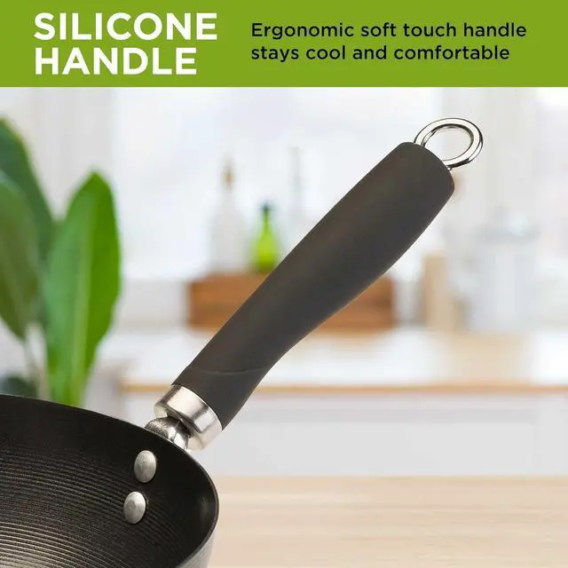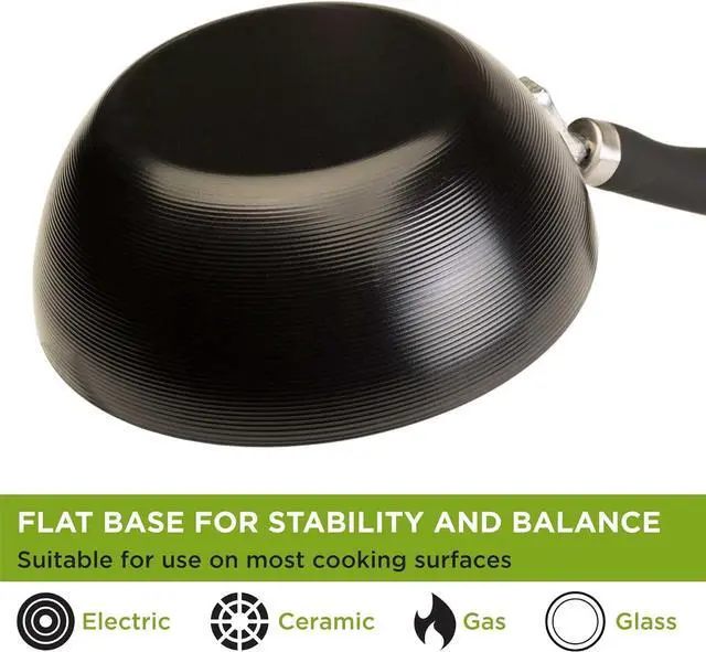 Flat base for balance which also enables the wok to sit directly on the burner, maximizing the heat in the pan.