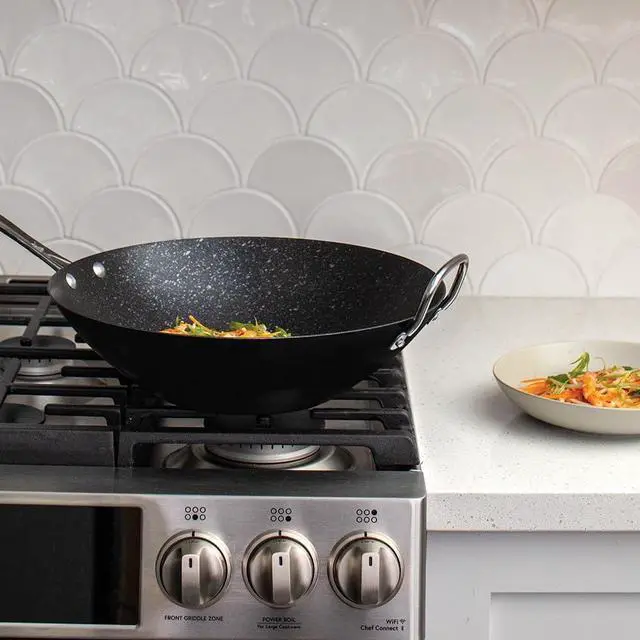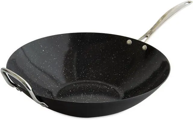 This aluminized steel Wok features cast stainless riveted handles for a secure grip and is your ticket to mastering stir-frying, deep frying, and steaming with ease