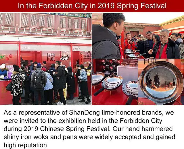 Chinese wok, made in China. Our woks have been through 12 processes, 36, 000 times of hand-hammering. It shines like a mirror. You can see all the hammer prints but hardly feel them. Mirror surface allows ingredients to slide smoothly inside the wok.