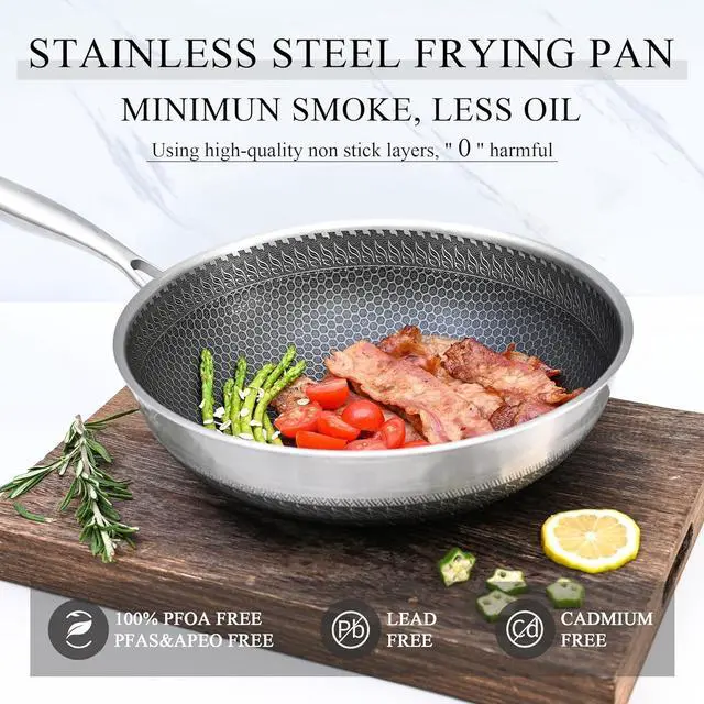 Great Choice- The Stainless Steel Dome Lid has a good seal, which can effectively keep the moisture and heat in the pot and speed up cooking. Riveted stainless steel handles stay cool with airflow technology. With excellent perfomance of rustproof and low maintenance, steam things in it without causing rust. Warm tips-when using this frying pan to fry eggs need to add the right amount of cooking oil.