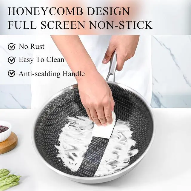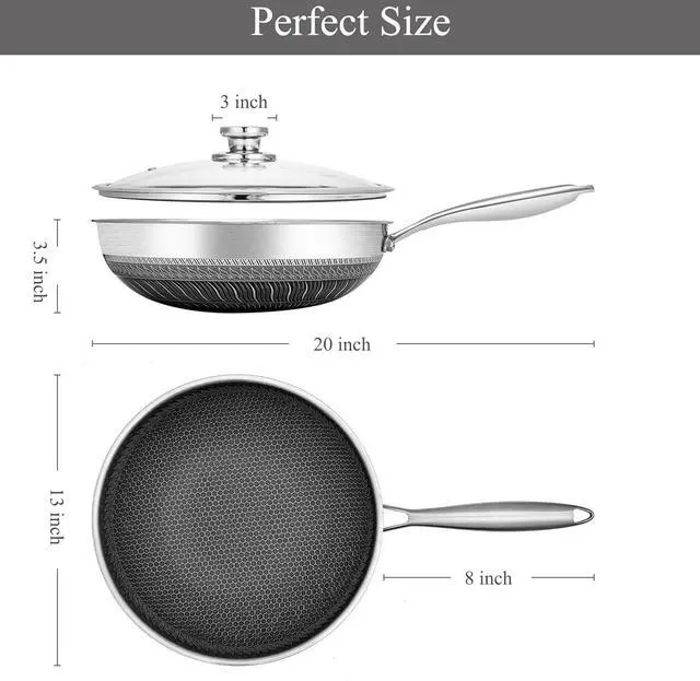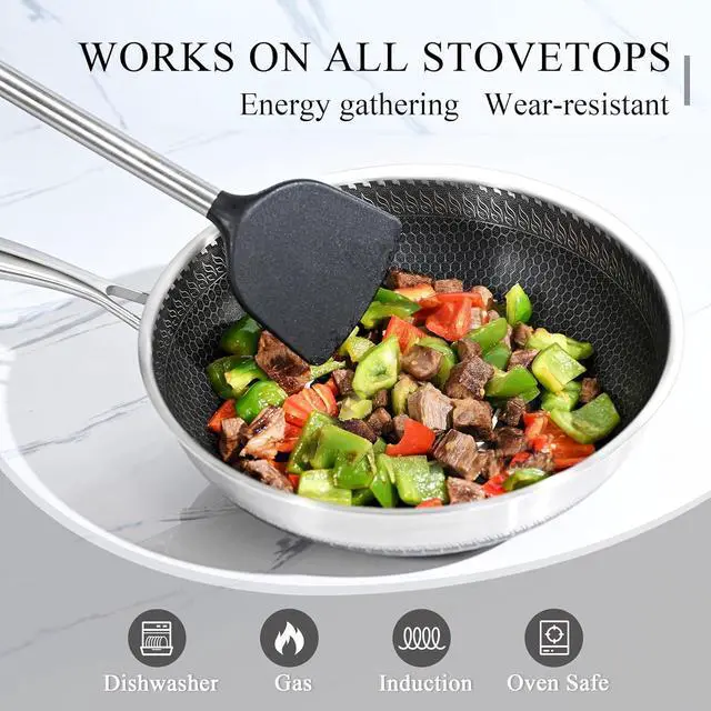 Versatile and Suitable Pan - This all in one pan is a great choice for both professional chef and home cook, suitable for small amounts and big cooking session. With this stainless steel pan you can finish the stir frying, cooking currys, chilli and spaghetti, braising and stew can be done easily. Please heat the wok before andding the cooking oil, than mix the food at the right pace so that the food does not stick to the pan. A flat wooden or silicone spatula will be recommend using