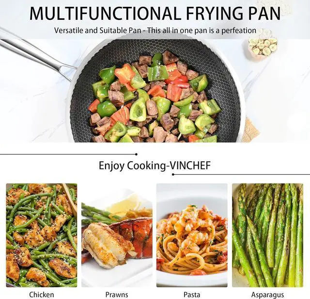 Suitable for All Stoves - VINCHEF Cookware is ready for any kitchen, thanks to compatibility with all types of cooktops including induction, gas, electric, and ceramic. The stainless steel bottom is designed to be compatible with induction cooktops for even temperature distribution and fast heating, making it easy to cook delicious meals every time.