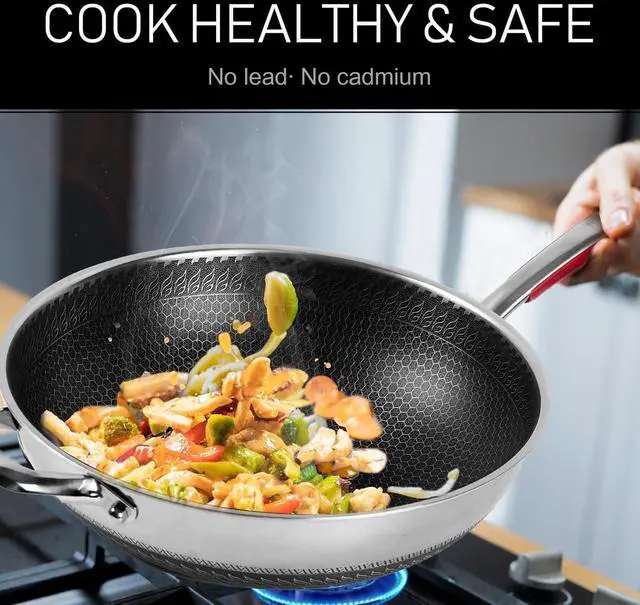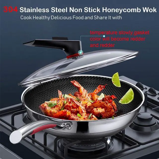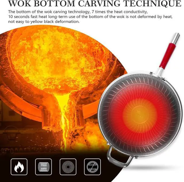 Woks & Stir-Fry Pans Bottom Adopts High-Precision Micro: Engraving Technology, Which Can Be Heated Uniformly And Rapidly, Has Honeycomb Structure Design And Uniform Distribution, Which Improves The Non-Stick Property Of The Wok Bottom. Pan Bottom Is Not Deformed And Is Not Easy To Blacken And Yellow After Long-Term Use. It Is Superior To The Non-Stick Property Of The Conventional Stainless Steel Wok Pan.