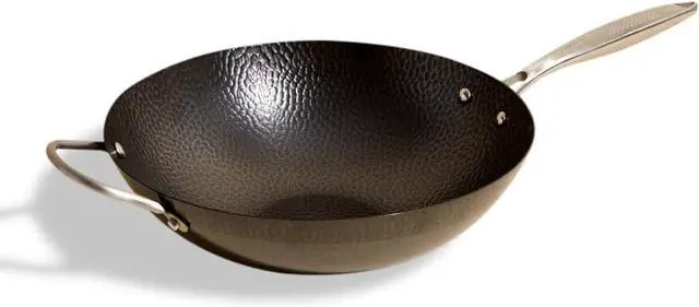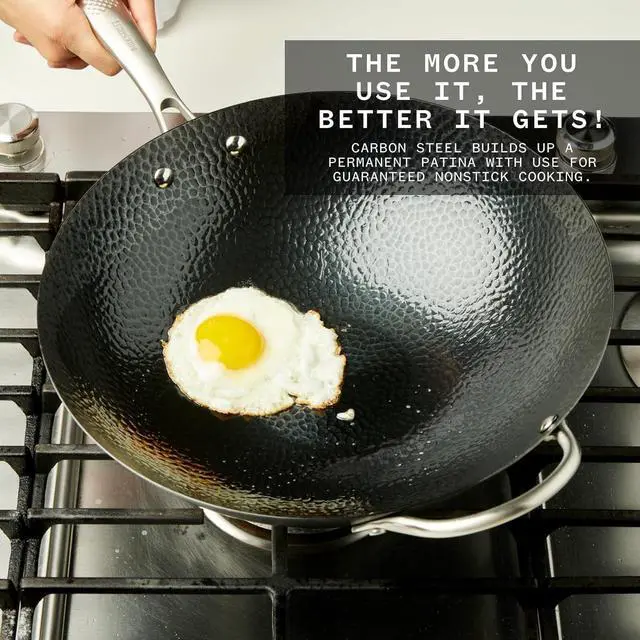 Hammered Surface: The carbon-steel, hammered treatment grows more nonstick with use.
