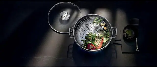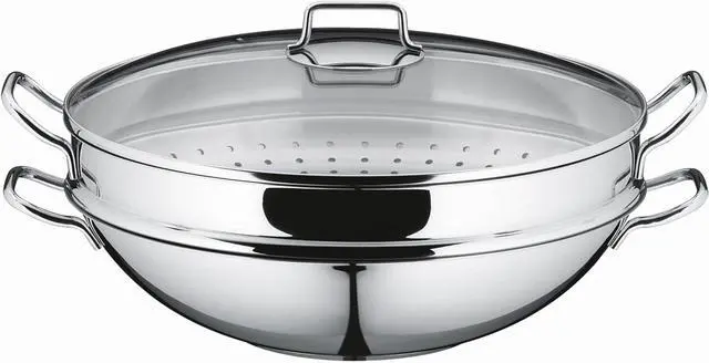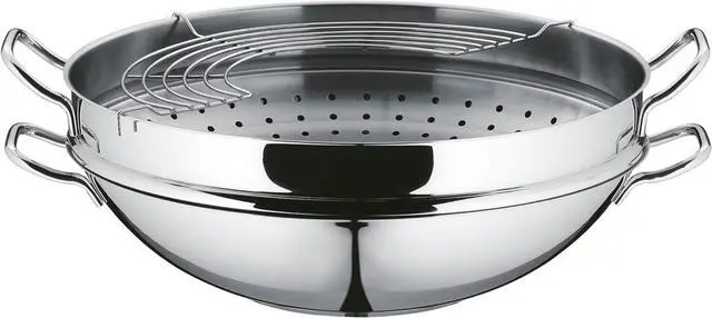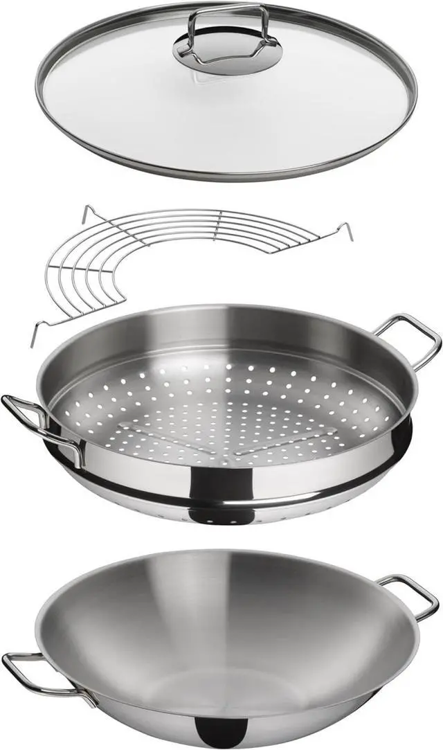 Inhalt: 1x Wok-Pfanne 36 cm - optimal für Herdplatten mit 22 cm, 1x Glasdeckel, 1x Ablagegitter, 1x Dämpfereinsatz, 1x Rezeptheft |