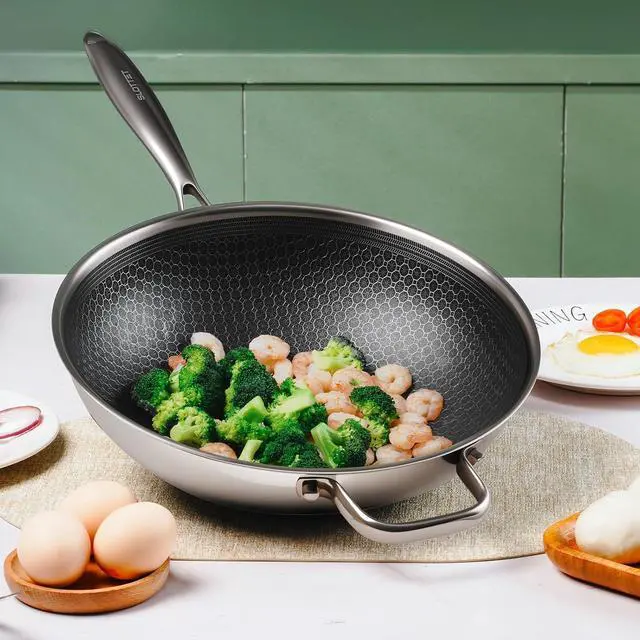 Easy To Clean: Hybrid non-stick technology provides the universal wok pan excellent non-stick effect. Useneutral detergent and a soft dish towel, you can easily hand washing the pan.