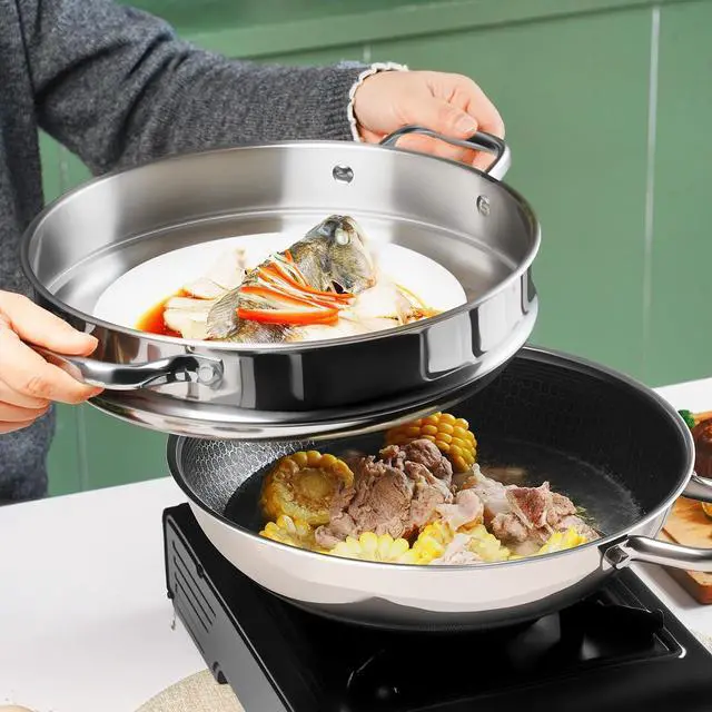 Multi-Function Steamer wok For Cooking: Suitable for steaming tamales, veggies, broccoli, couscous, pasta and dumplings, crab legs, shrimp, lobster, oyster, clam and other seafood.