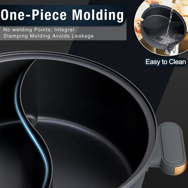 Enjoy Dual Flavors in One Pot - This hot pot with divider is 100% PFOA-free. The dual flavor electric pot is designed with seamless, weld-free construction. the s-shaped divider is designed to prevent spills and odors while allowing you to enjoy two flavors in one pot at the same time. This unique feature transforms your cooking experience, making it easy to enjoy a variety of soups in our electric shabu shabu pot.