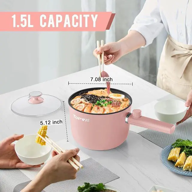 Ideal Capacity & Handle DesignThis 1.5L electric cooker is ideal for 1-2 people. With a diameter of 7.08 inch and a depth of 5.12 inch, this electric pot ensure you plenty of space to cook ramen, hot pot, sauté and stir-fry. This frying pan has a long handle design to ensure comfortable grip when picking up the cooker, make frying and cleaning easier.