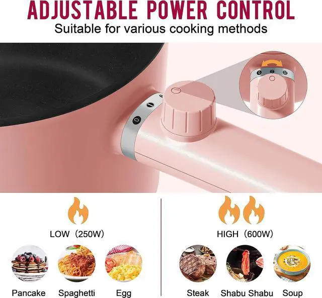 Dual Power SettingOur Topwit electric hot pot is equipped with dual power settings (250W and 600W), which can provide you with a variety of choices for your daily meals. It is perfect to make oatmeal, spaghetti, pancake and egg under 250W power. When cooking steak, salmon, sauté or hot pot, you can switch to the 600W power.