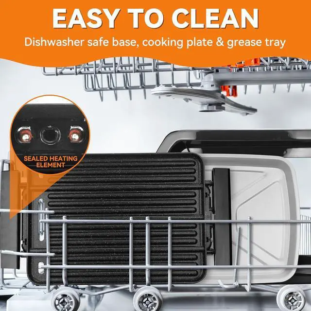 [EFFORTLESS CLEANUP]: Beyond being non-stick and wipe-clean, the removable cooking plate and grease tray are dishwasher safe, transforming cleanup into a simple task.