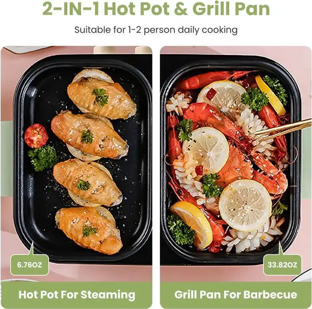 Suitable Capacity: Designed with a 33.82OZ hot pot and a 6.76OZ frying pan, able to accommodate 1-2 users at one time. Ideal for daily cooking needs or couple meals. 14.17 x 9.45 x 5.5 in Compact size makes it suitable for small dormitories and kitchens. Besides, portable side handles ensure convenient moving.