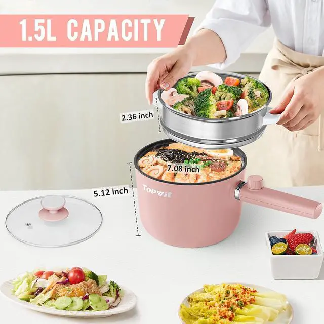 Ideal Capacity & PortableThis 1.5L electric cooker is ideal for 1-2 people. With a diameter of 7.08 inch and a depth of 5.12 inch, this electric pot has a suitable size to store and carry, making it a dorm room essentials. This hot pot is also suitable for small spaces such as small kitchens, single apartments, offices, vans and camping.