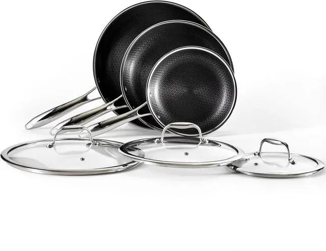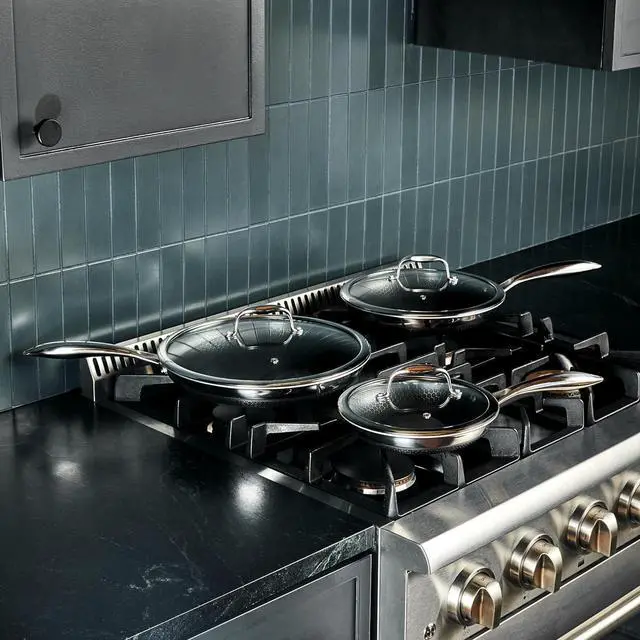 HexClads patented Hybrid technology features a laser-etched hexagonal nonstick surface that combines both stainless-steel and our TerraBond ceramic coating for the ultimate sear and easy cleaning.