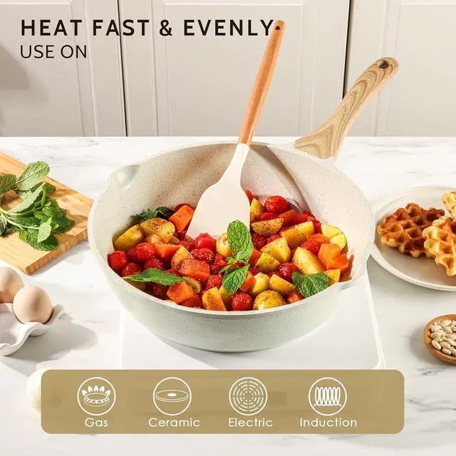 SUPER NONSTICK FRY PAN - The ceramic surface is smooth and super nonstick, eggs can just slide right off the pan without effort. This saute pan makes cooking easier and your food is much more flavorable with less oil!